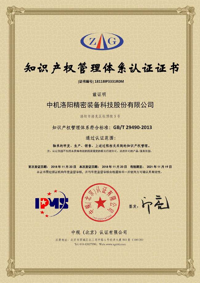 2018年11月12日至13日,中规(北京)认证有限公司工作人员到我公司进行知识产权管理体系审查认证,经过为期两天的检查与考核,对公司知识产权管理给予了肯定,最终颁发“知识产权管理体系认证证书”。