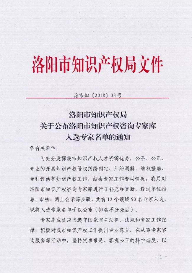根据洛阳市知识产权局于2018年12月3日发布的《洛阳市知识产权局关于公布洛阳市知识产权咨询专家库入选专家名单的通知》(洛市知【2018】33号),中机洛阳精密装备科技股份有限公司总经理王景夏先生,入选为专家库成员。